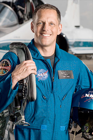 NASA astronaut candidate Bob Hines poses in front of a T-38 jet in a blue flight suit, just like the one he has worn as a NASA research pilot at Johnson Space Center in Houston since 2012. (NASA)