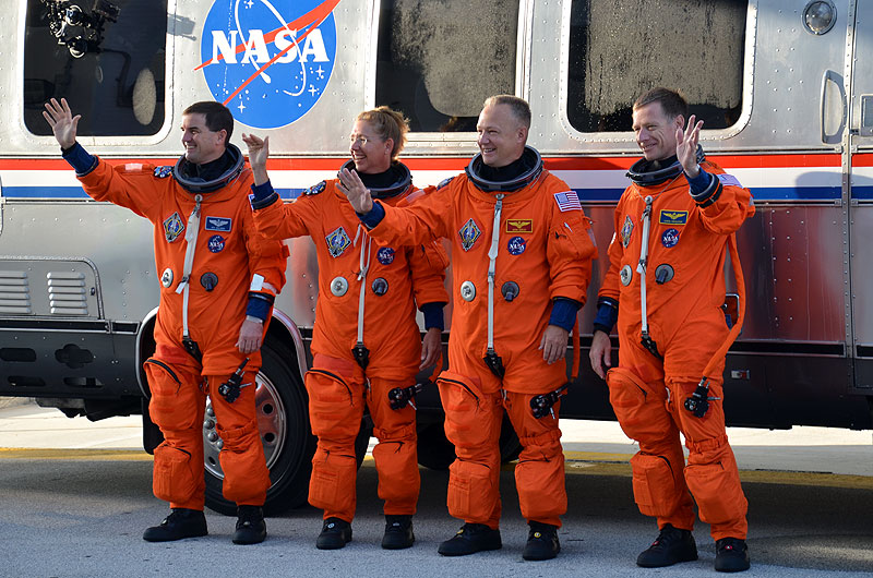 Led by mission commander Chris Ferguson, the four crewmembers donned bright orange pressure suits and boarded shuttle Atlantis on Pad 39A at Kennedy Space Center in Florida.