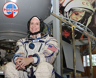 Kate Rubins climbs on board the Soyuz MS-01 spacecraft for a "fit check" dress rehearsal activity. (NASA/Alexander Vysotsky) |