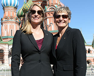Kate Rubins and Peggy Whitson pose for a photo with St. Basil's Cathedral in Moscow as a backdrop. (NASA/Stephanie Stoll) |