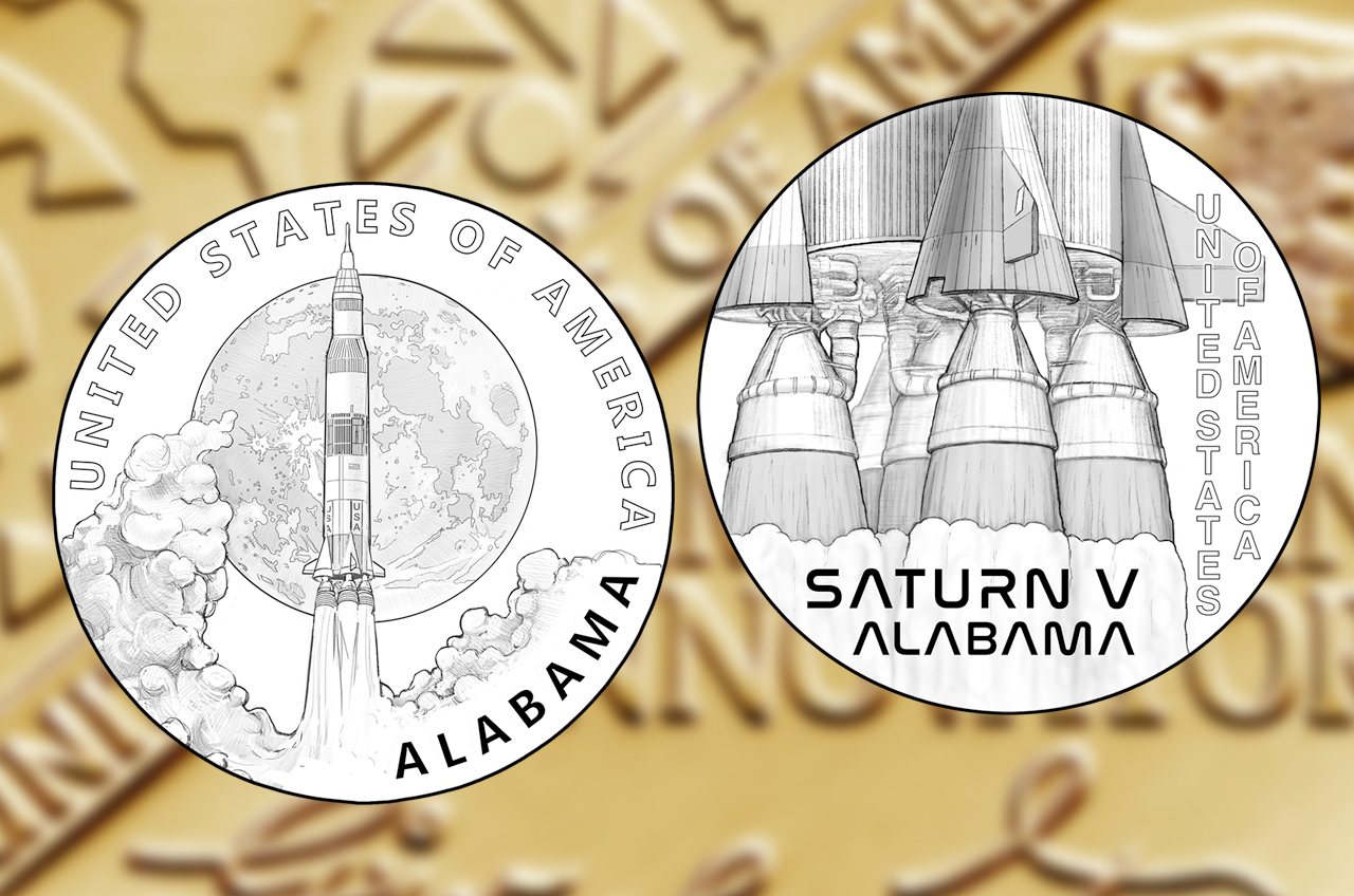 Alabama Governor Kay Ivey proposed the moon rocket as the state's theme for the innovation coin series. In response, the mint's artists worked with liaisons and experts to develop 11 candidate designs, each focusing on the Saturn V, which stood as tall as a 36-story building and, at launch, generated more power than 85 Hoover Dams.