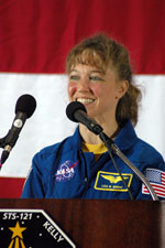 Breaking with tradition a bit, Lindsey then invited the flight directors that led each part of their mission to the stage. Annette Hasbrook, representing the station team, Steve Stitch, who led both ascent and entry flight control teams, and lead STS-121 shuttle flight director Tony Ceccacci took turns at the mike thanking their teams and the crew.