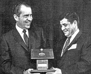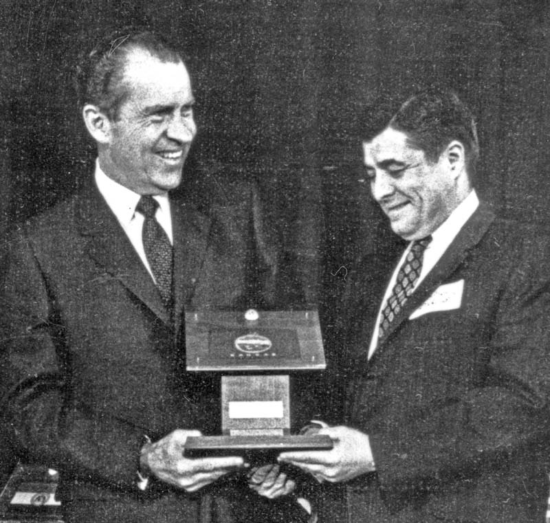 President Richard M. Nixon presenting Kansas Governor Robert Docking with a display featuring four small specks of moon rock during a 1969 White House ceremony. (Kansas Historical Society) |