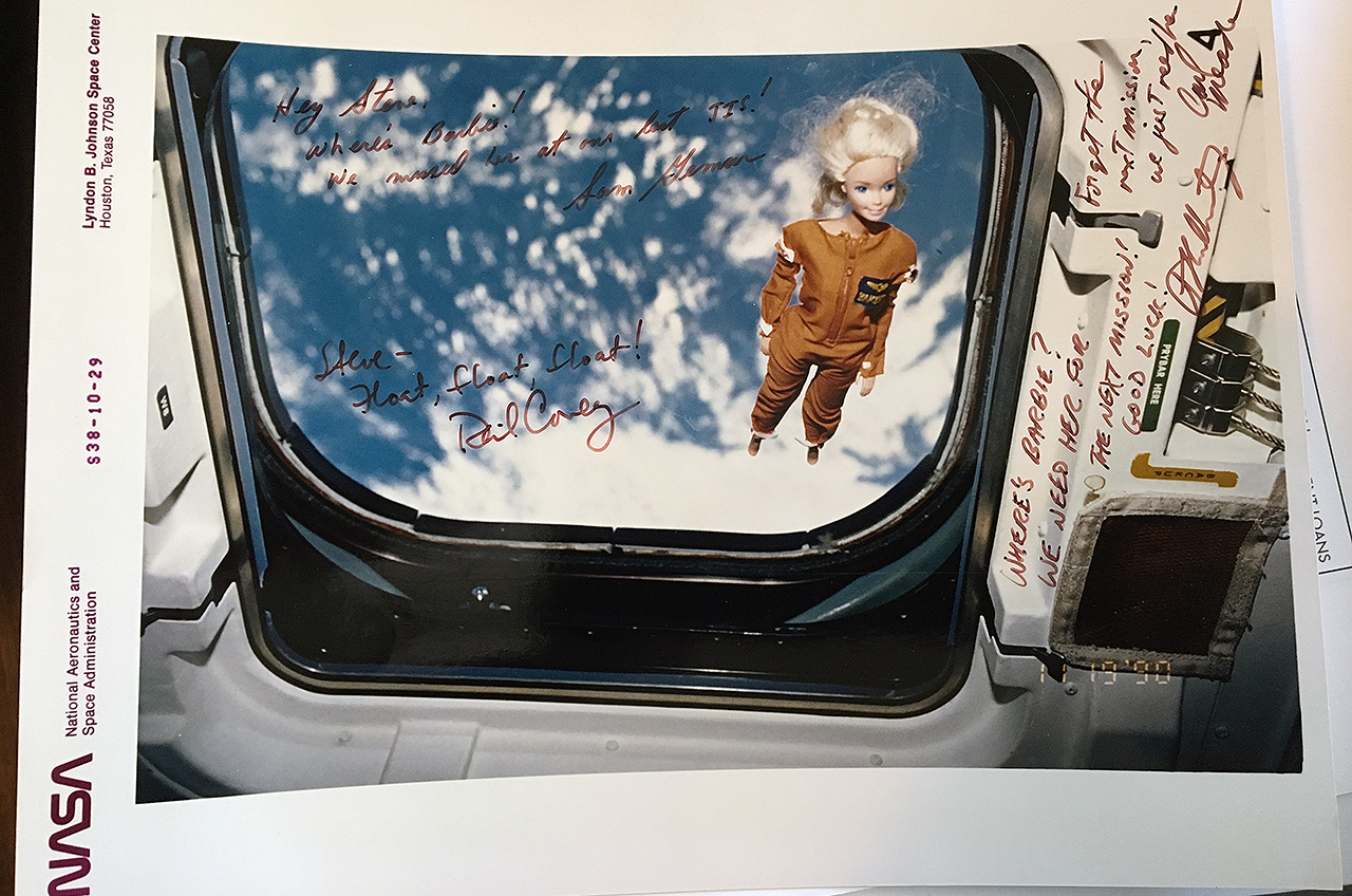 Later, the astronauts inscribed and autographed one of the photos for Denison, writing in jest that Barbie was still needed for their next simulator run (Barbie and Denison left NASA within months of the mission ending.)