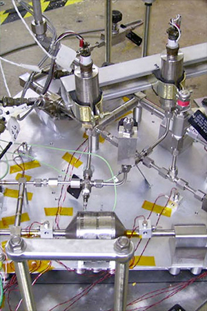 A special pressurization control assembly test, pictured here, was conducted to verify the space shuttle heritage regulator would still operate with a pyrovalve shock and slam start. (NASA/JPL-Caltech)