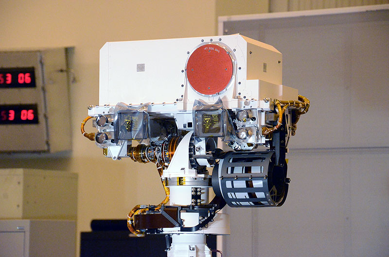 Curiosity's "ChemCam" (protected here by the red cover) will fire a laser to analyze the composition of vaporized materials from areas smaller than 1 millimeter on the surface of rocks and soils. ChemCam will also use the laser to clear away dust from Martian rocks.