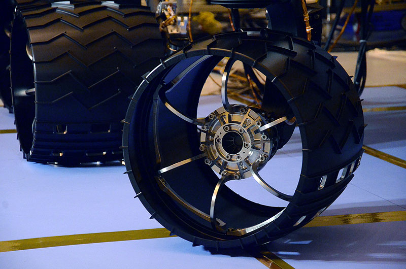 The Mars Science Laboratory has six wheels, each with its own individual motor. The wheels are designed to roll the rover over obstacles up to 25 inches (65 centimeters) high and to travel distances up to 660 feet (200 meters) per day on the Martian terrain.