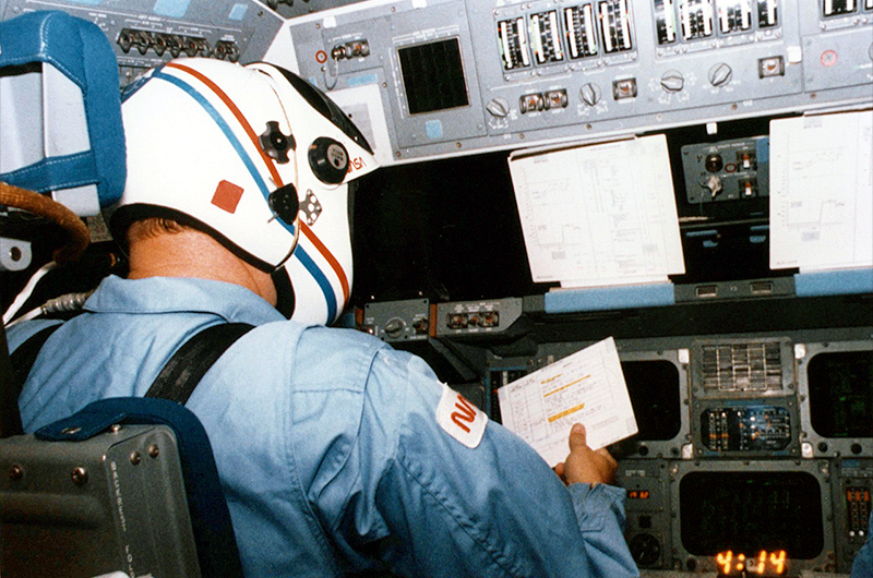 Karol "Bo" Bobko, STS-51J commander, reviews a cue card at his station on board the flight deck of space shuttle Atlantis in October 1985. (NASA) |