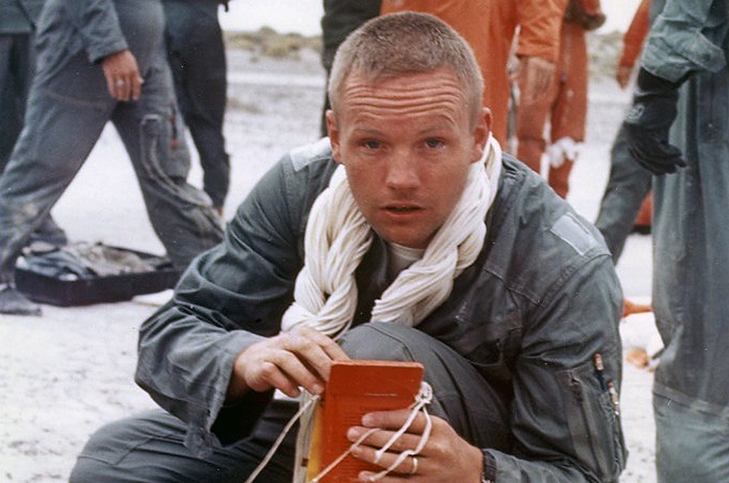 Before ever flying in space, astronauts had to go through basic training. Here Neil Armstrong is seen working with parachute lines.