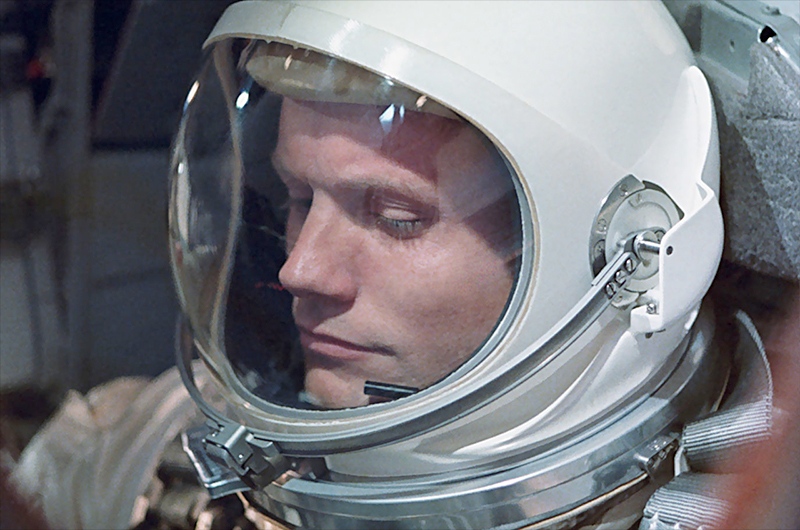 Neil Armstrong's first flight into space was as command pilot of Gemini 8, the sixth flight of NASA's two-seater spacecraft. Armstrong's crewmate was David Scott (right). Scott would later become the seventh man to walk on the moon.