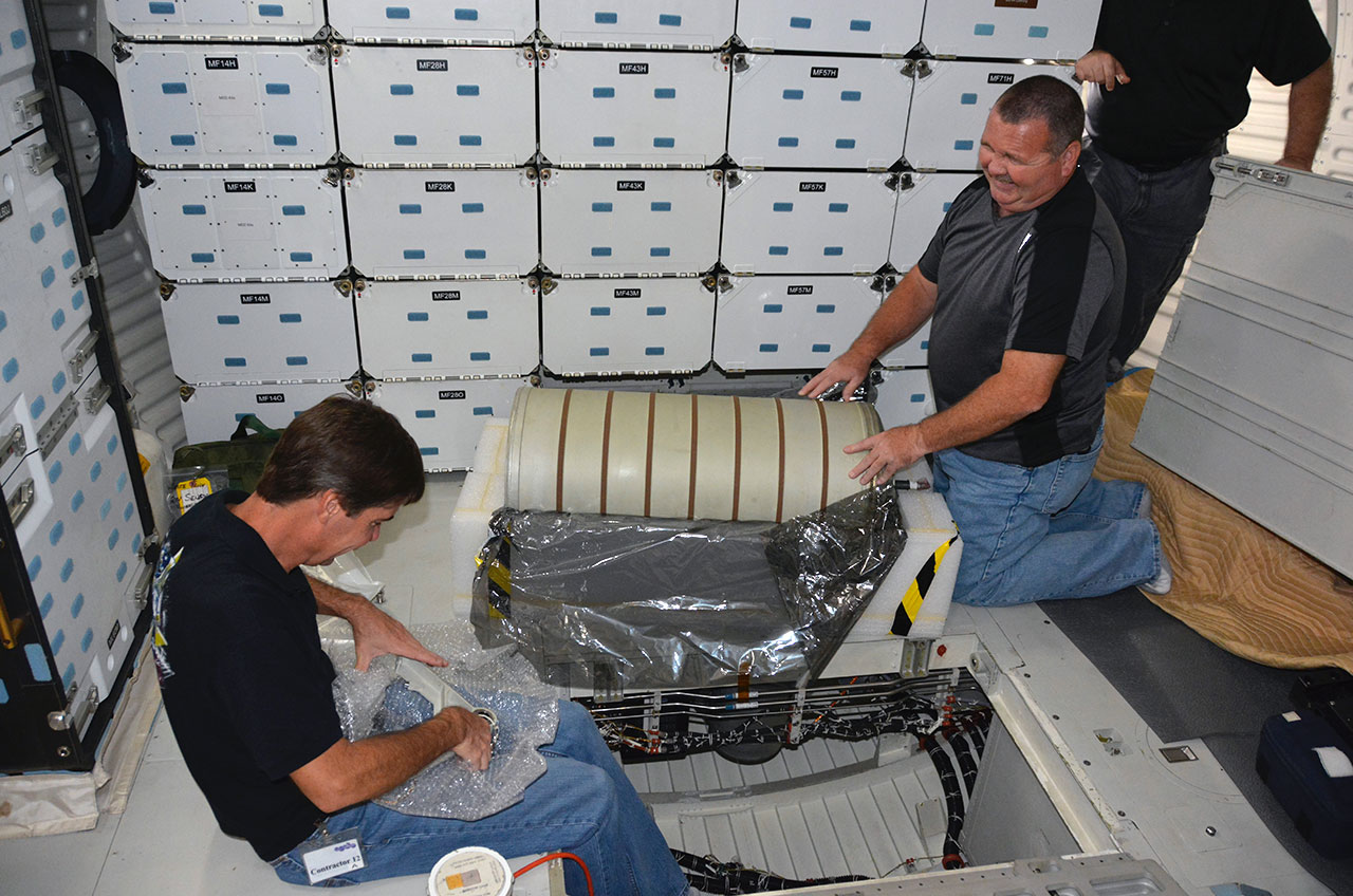 Members of NASA's test and operations support team were in Los Angeles this week to reinstall the waste water tank. Just as it was removed a year ago, the 3-foot-long (0.9 meter) tank was carried into Endeavour through the crew hatch and then lowered under the mid-deck floor through a removable locker once used to hold the canisters that scrubbed the shuttle's air supply of carbon dioxide.