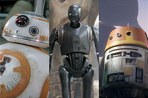 The ball-shaped BB-8 astromech droid was introduced in "Star Wars: The Force Awakens" and appears in "The Last Jedi." K-2SO, a humanoid droid, was in "Rogue One," and Chopper, also known as C1-10P, appears on the animated TV series, "Star Wars Rebels."