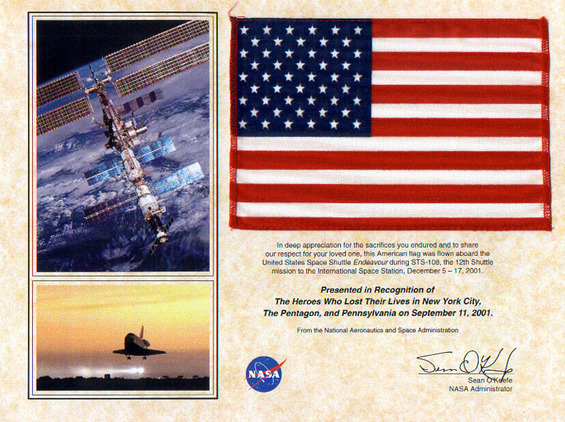 "NASA wanted to come up with an appropriate tribute to the people who lost their lives in the tragic events of Sept. 11," he said. "America's space program has a long history of carrying items into space to commemorate historic events, acts of courage, and dramatic achievements. 'Flags for Heroes and Families' is a natural extension of this ongoing outreach project."