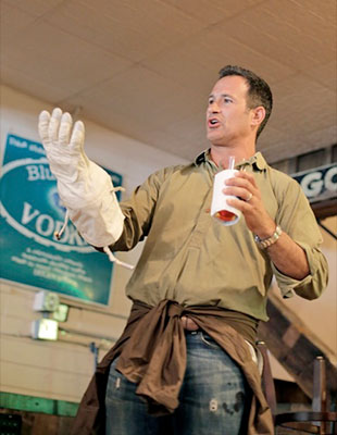 Dogfish Head founder Sam Calagione compares an ILC spacesuit glove to Celest-jewel-ale's spacesuit koozie. (Dogfish Head) |
