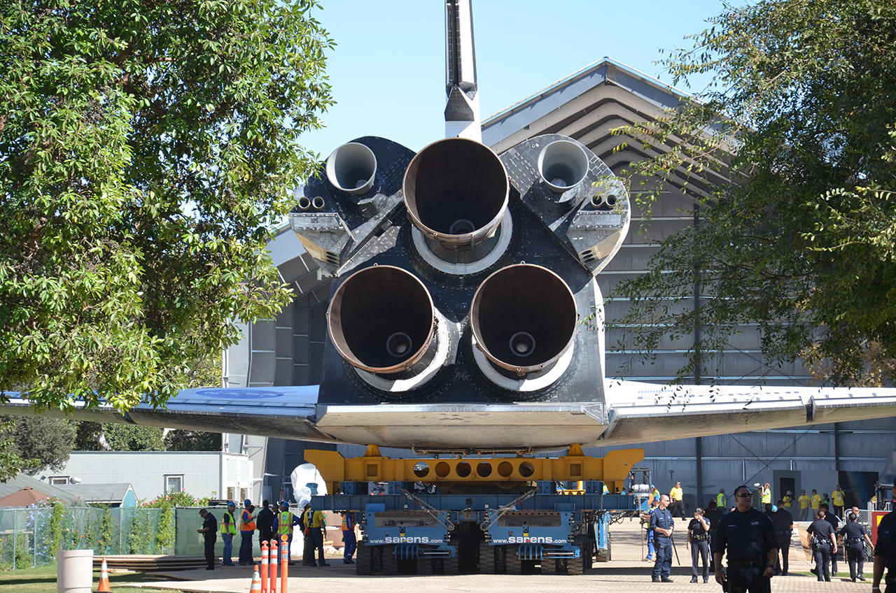 Last month, Endeavour crossed the country, flying from NASA's Kennedy Space Center in Florida to Los Angeles mounted on a modified Boeing 747 jumbo jet. The orbiter was then loaded onto the transporter and underwent a few final display preparations while temporarily sheltered in a United Airlines hangar at LAX.