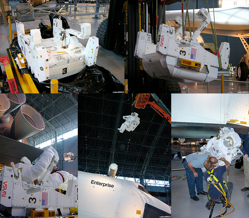 A custom mannequin and replica spacesuit were built for the suspended exhibit, which is positioned over the space shuttle Enterprise. The MMU is displayed at an angle that is reminiscent of the photo captured of McCandless flying detached, over the Earth's horizon.