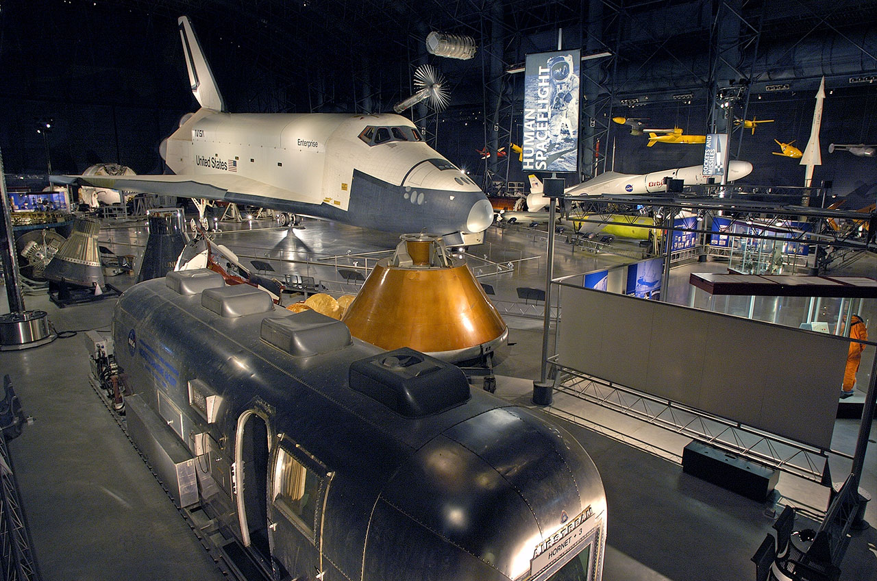 More than 100 large space artifacts are housed inside the hangar. The biggest and heaviest, including Enterprise, an instrument ring segment from a Saturn V rocket that was never built and a space shuttle main engine (SSME) are displayed at ground level. An array of missiles, satellites and space telescopes hangs from above.