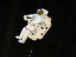 UPDATE: Oct. 26, 2004 — The propulsion backpack that made the world's first untethered spacewalk possible, flew again today — if only with the help of cranes and wires.