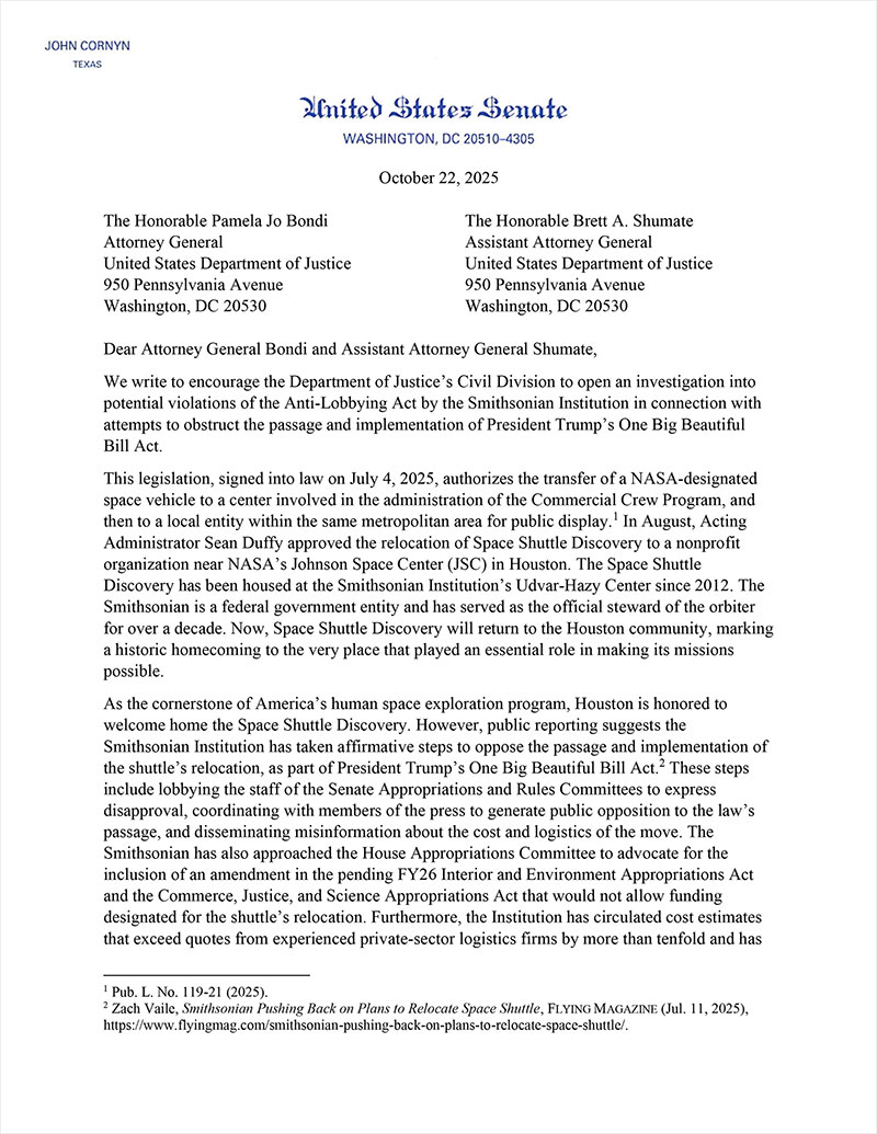 Senators John Cornyn (R-TX) and Ted Cruz (R-TX), together with Rep. Randy Weber (R-TX-14) on Wednesday (Oct. 22) sent a letter to the DOJ urging the Smithsonian be investigated for violating the Anti-Lobbying Act. They claim that the institution — Discovery's home for the past 13 years — improperly used appropriated funds to influence Congress with regards to relocating the winged orbiter.