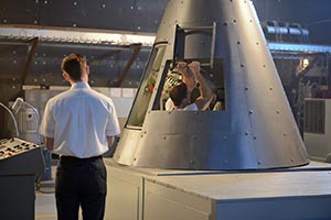 After the title card, the scene changes to Shepard in the Mercury spacecraft simulator. Scott Carpenter is serving as his capcom [capsule communicator], as Shepard proceeds through a retro-fire sequence. "I'm showing that the spacecraft is tumbling. Should I be in retro attitude bypass?" asks Shepard.