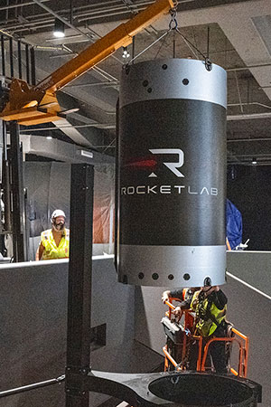 Workers install the upper stage of a Rocket Lab Electron in the new Kent Kresa Space Gallery, a section of the California Science Center's Oschin Air and Space Center. (California Science Center)