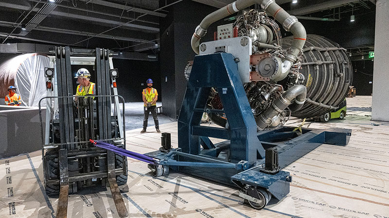 A walkthrough solid rocket booster segment and a space shuttle main engine were the first artifacts installed in the "Rocket Science" section of the new Kent Kresa Space Gallery in the Samuel Oschin Air and Space Center. (California Science Center)