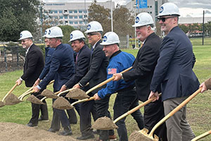 Former NASA astronaut Garrett Reisman (at center) joins city and museum officials to break ground for the Columbia Memorial Space Center Inspiration expansion, Nov. 17, 2025. (Francis French)