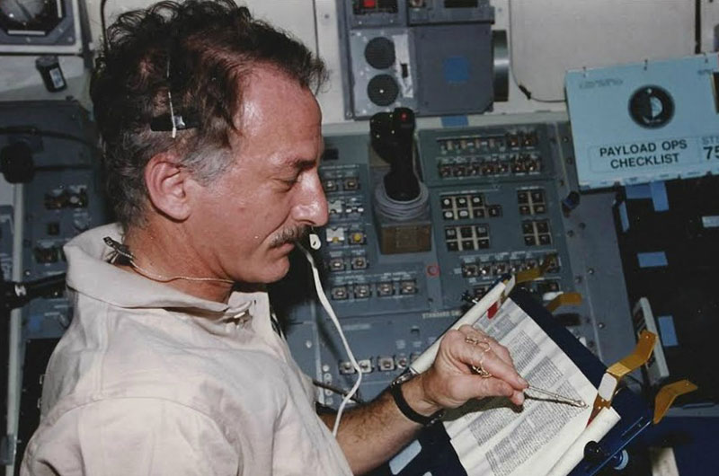 NASA astronaut Jeffrey Hoffman flew and read from the Torah on board the flight deck of space shuttle Columbia during the STS-75 mission, his fifth spaceflight, in 1996. (Space Torah Project/NASA)