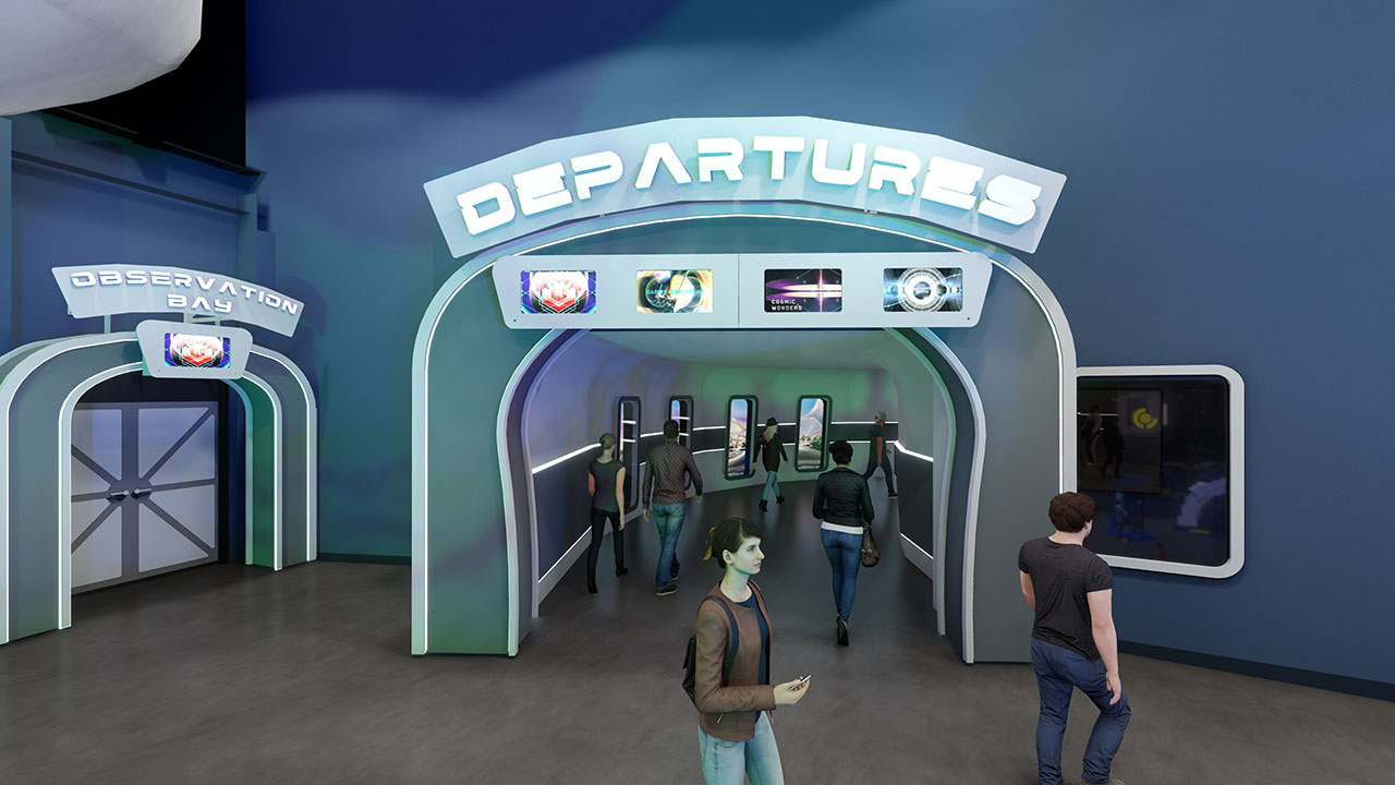 "Upon entering the concourse, travelers will be surrounded by the sights and sounds of a galactic spaceport," the Visitor Complex described. "Atmospheric airport chatter will surround travelers as they peer through windows at distant views of active launches and landings. The main concourse features multiple screens that will showcase destination promo videos and departure and arrival information."