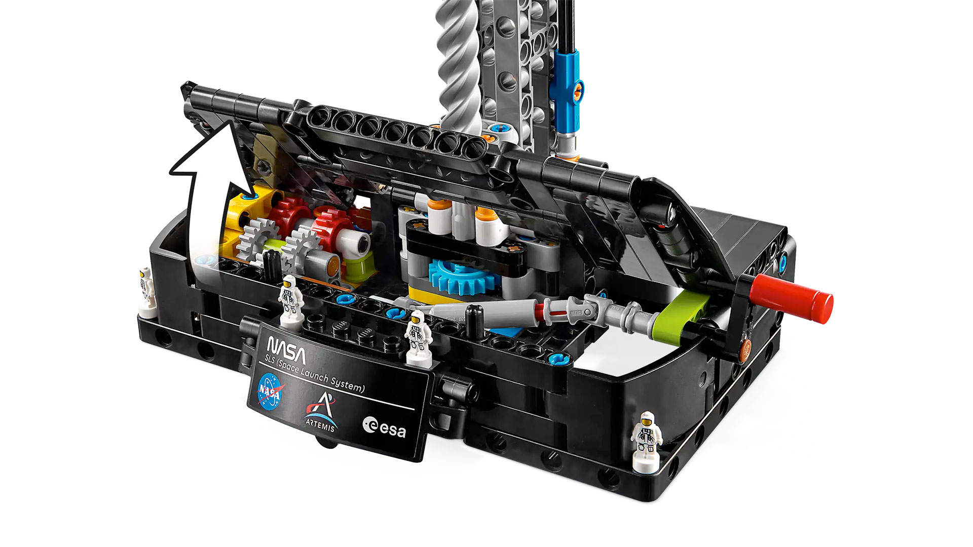 The lid of the mobile launcher opens to reveal the gears that set the LEGO Technic NASA Artemis Space Launch System Rocket into motion. (LEGO) |
