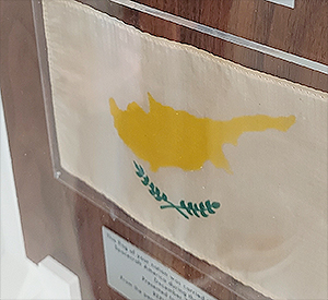 The Apollo 17 goodwill moon rock display for the people of Cyprus includes a Cypriot flag flown on the mission. (US Embassy Cyprus) |