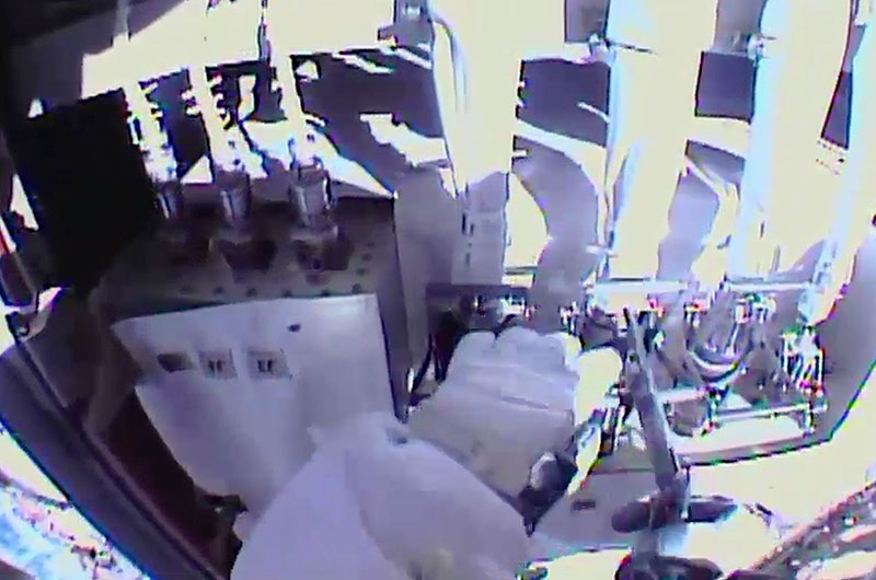 Working along the starboard, or right, side of the station's backbone truss, Mastracchio (riding on the space station's robotic arm) and Hopkins first set about de-mating "quick disconnect" fluid lines from the faulty pump.