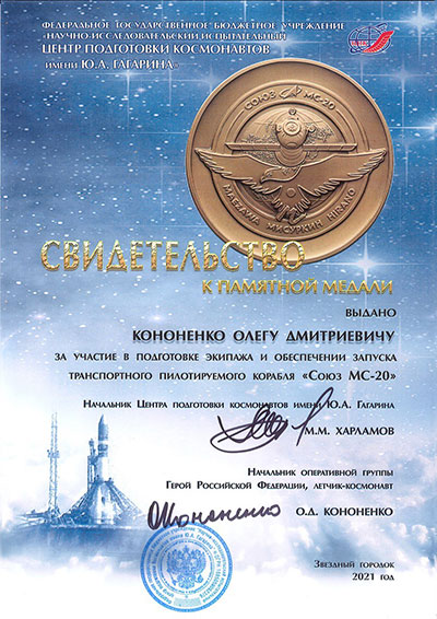 The Gagarin Cosmonaut Training Center produced 40 medals for their staff involved in preparation of the Soyuz MS-20 crew. They want to continue the practice with future Soyuz crews.
