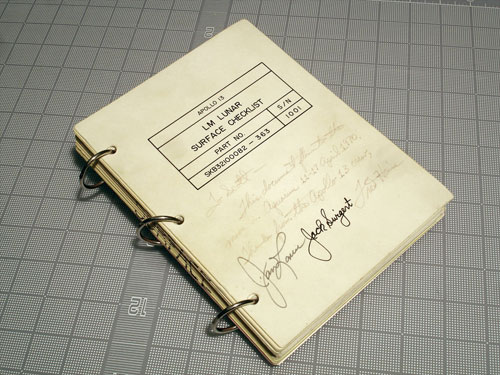 After the crew's safe return, the crew arranged a special thank you for his important role in returning them safely. On the cover of the checklist the crew inscribed this message: