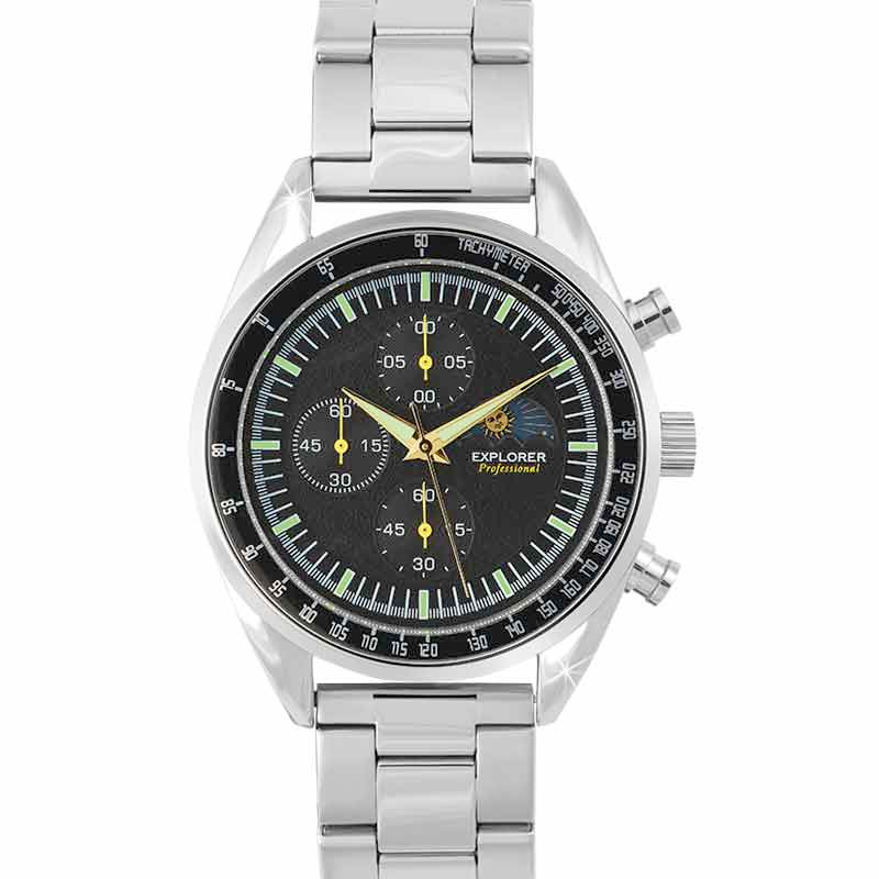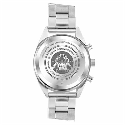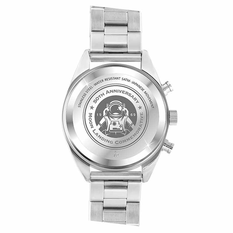 The Apollo Lunar Explorer Chronograph is a masterfully crafted watch designed to help celebrate the mission that changed the world forever. Inspired by the timepiece worn by the Apollo 11 crew as they first landed on the moon, the watch's caseback is engraved with the phrase "50th Anniversary Moon Landing Commemorative."The watch features three chronograph sub-dials (60-second, 60-minute, and 24-hour), a tachymeter, and a moon phase function. The Apollo Lunar Explorer Chronograph is ideal for any man who's passionate about American history or high-quality time pieces! NASA and OMEGA have not approved, endorsed, nor authorized this product. - Material: Stainless Steel