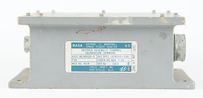 I was the top bidder on this Decoder Assembly, Channel Calibration Command. From the RR Auction lot description, and the look of it, and from prior research into the Instrument Unit for another item in my collection, I thought I'd be able to find its location in the IU. But I haven't been able to, even with excellent websites like this one that shows every panel. So was it somewhere else in the Saturn spacecraft, or can I just not spot it? Also, can anyone point me to a description of what it did? I've found a couple of brief mentions of them, such as in Apollo mission summaries (like one needing to be replaced before the mission); but not a good explanation of its "duties."