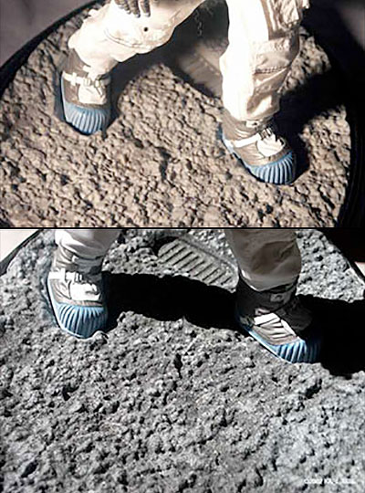 To duplicate the "very, very fine grained" texture of lunar soil, I sprayed the surface with Plasti-Kote "Fleck Stone" textured paint, sprinkled it with plaster dust, covered it with black primer and dry brushed it with a variety of shades of gray and metallic paints, topping it with an acrylic clear coat to protect it.