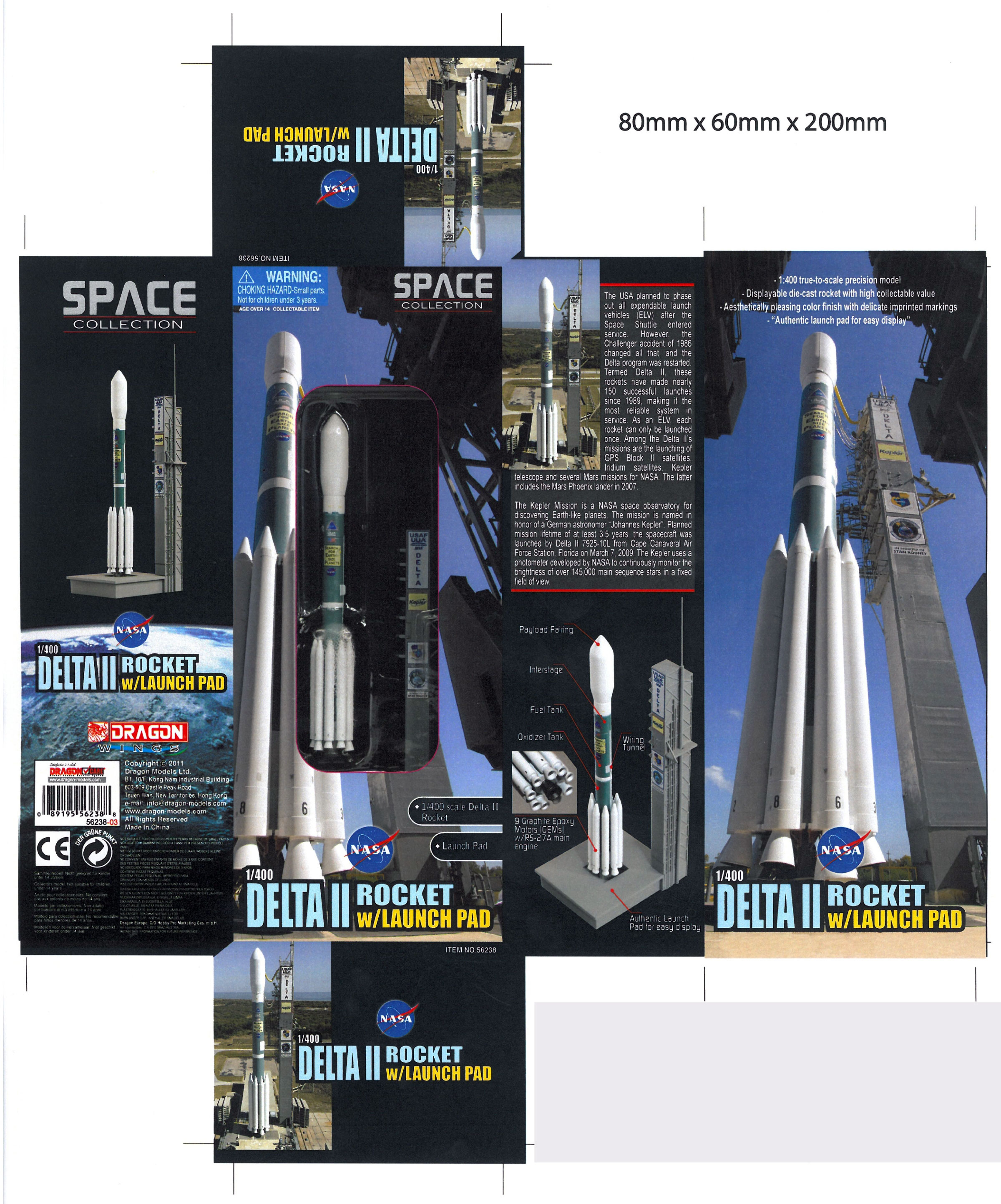 Dragon Wings formally revealed today its 1:400 Delta II rocket with launch pad. A Delta II rocket consists of Stage I tanks, solid rocket boosters, interstage, Stage II tanks, optional Stage III rocket motor, and finally the payload fairing (nose cone). Among the Delta II’s missions are the launching of GPS Block II satellites, Iridium satellites, and several Mars missions for NASA. The latter includes the Mars Phoenix lander in 2007. The future of the Delta II space rocket is uncertain beyond 2011 once the Medium Launch Vehicle 3 contract with the US Air Force expires, but despite this it has proved a hugely successful design to date. Courtesy Dragon, here is a first look at the (exploded) packaging for the Delta II.  |