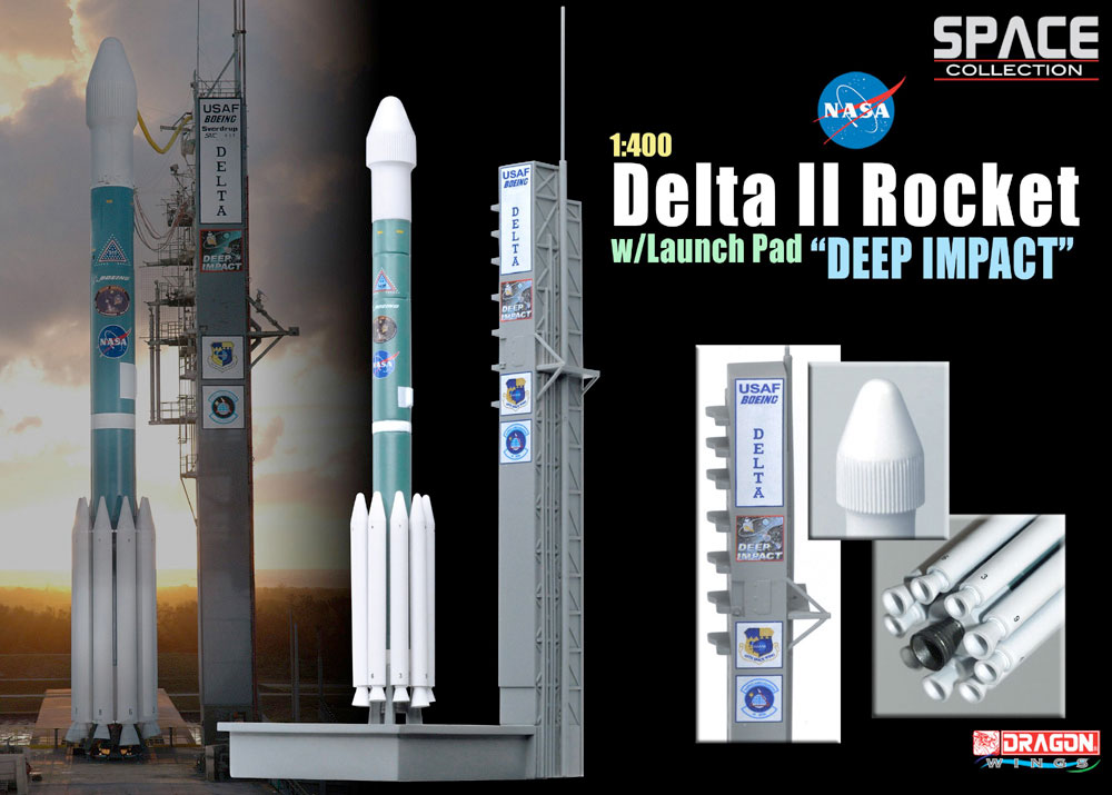 There's a set mentioned on Dragon Models USA containing three Delta models and their launch pads: Deep Impact (#56243); Mars Rover Opportunity (#56339); Shark's mouth (#56334). All previously released models. No price given.1/400 Delta II Rockets w/Launch Pads Set |