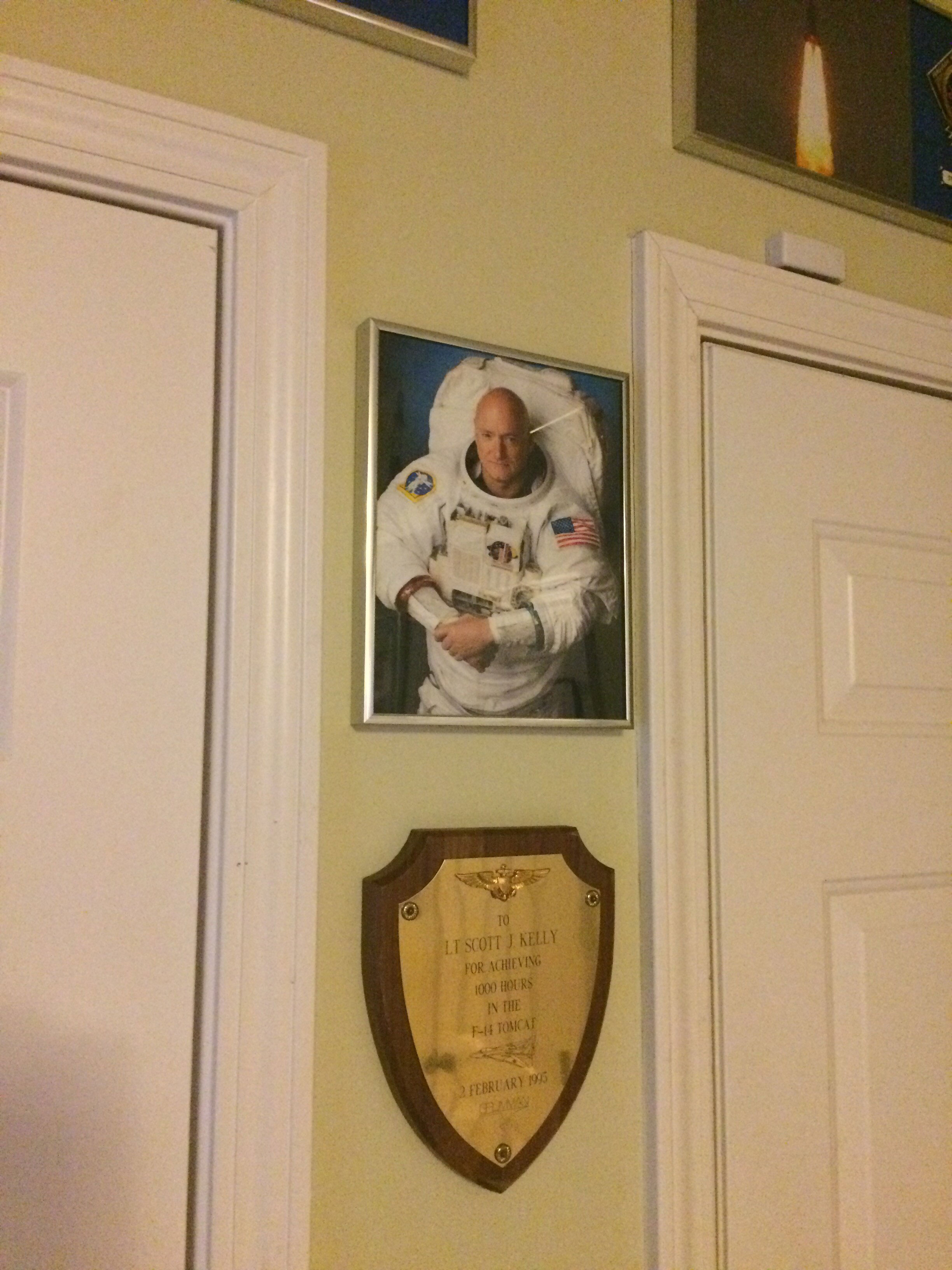 Our second project was something we have had in mind for a few years and finally took the time to make it happen. We got together photos of all the launches we have been to and made an individual frame with the photo we took of that launch, the flight patch and a small plaque with the flight and date on it. We then placed them all in order on the wall above our exit to the outside. The photo shows the display, however I could not get them all in so there are four more on each side if that which is seen in the photo. Now every time we leave the house we leave with a launch memory. Also on that same area we have a photo of Scott Kelly and his plaque for 1000 flights on a F-14 Tomcat.