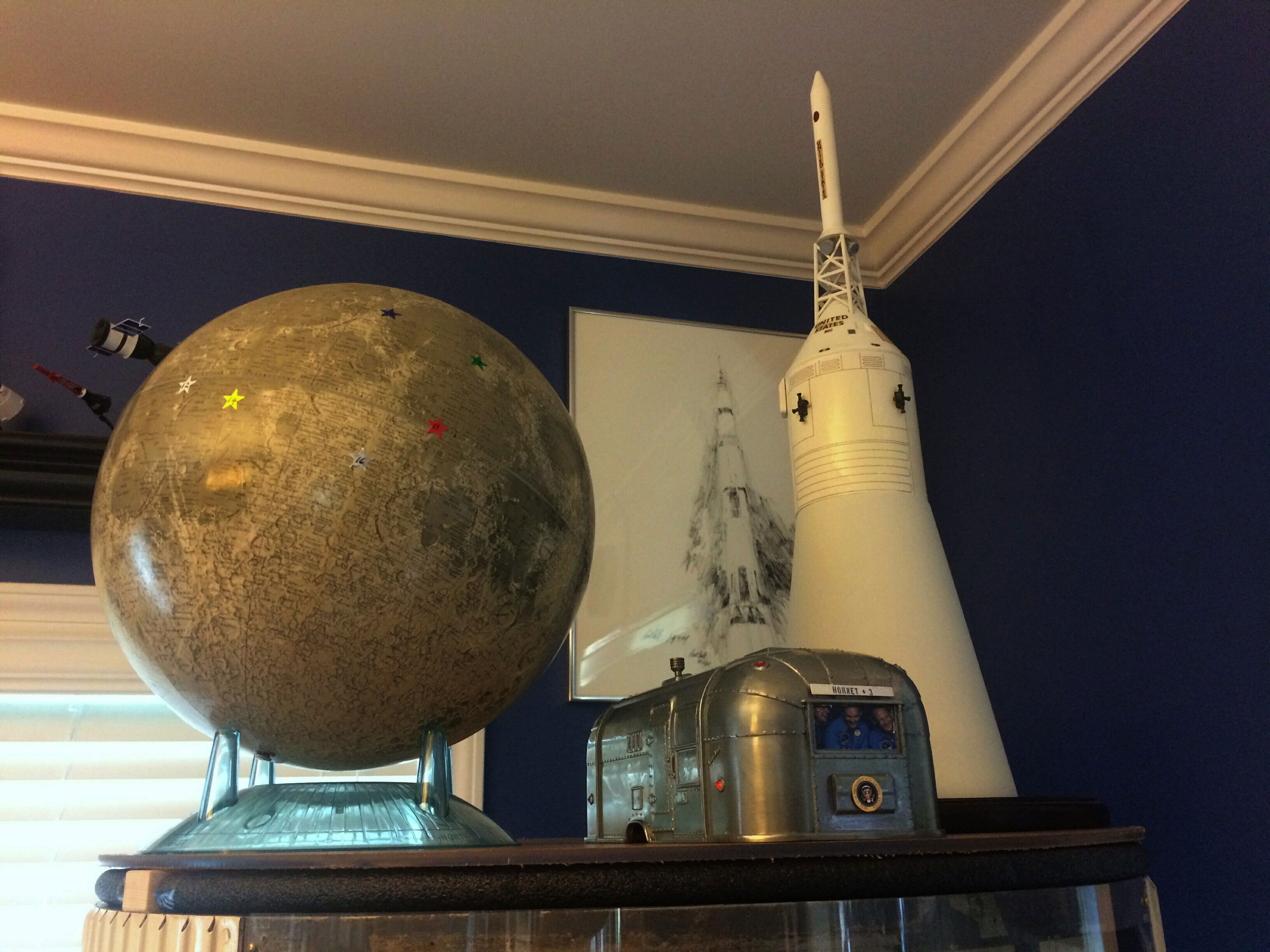 After a few years in the making, we finally made the trip to pick up a Saturn V and Saturn IB both in 1/48 scale, models that Carlos (cS: Scorpius) has had in work for us. When he started, he lived in Champaign, Illinois, not a short drive from here in Guyton, Georgia but okay. When he finished, he was in Cheyenne, Wyoming, a significant drive. If you search you will find that Carlos has built a number of models for the Kollection (1/48 Skylab and a 1/12 CSM scratch build to name a couple) and these two new Saturns are every bit the quality build that his amazing talents can turn out. Included into the models are a few of the 3D parts Michael Key produced in support of the build and it was exciting to get those two working together on the same build. Jackie and I did not want to even think of shipping these models, so we had determined when the time was right that we would pack up the Tahoe and head west. We left out on Friday, Sept. 2 at the tail end of hurricane Hermine (tropical storm as it passed over our area). We headed up north and west to see Liberty Bell 7 in the Children's Museum in Illinois, swung by the American Pickers' original store front in Iowa, Minuteman Missile Museum in South Dakota (they let you run 80 mph on those highways, legally), the South Dakota Air and Space Museum, Wyoming State Museum (hey, they have a missile base in Cheyenne so there was some space items there), the Texas Air & Space Museum in Amarillo, Texas to see GII s/n 146 Shuttle Training Aircraft (STA) on display (they let you go inside)...  ...Stafford Air & Space Museum in Weatherford, Oklahoma, Frontiers of Flight Museum in Dallas (Apollo 7 CM on display), Houston to Johnson Space Center and a tour of our own Robert Pearlman's space collection, Infinity Science Center in Mississippi, then home. That was a 5,000 mile driving adventure and those were only the space highlights. Here are the photos of the Saturns picked up in Cheyenne inside the Tahoe (first two stages together just fit in the back), as well as the new display at home. The photo does not do them justice as the ceiling height is 13 feet — the Saturn V is huge! This has been a dream of mine since I can remember to have all the 1960's U.S. human space vehicles in a large scale, i.e. 1/48. We now have it.