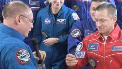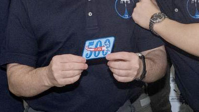 Terry Virts, Anton Shkaplerov and Samantha Cristoforetti marked their 100 days in space on Tuesday (March 3) posing with the patches aboard the International Space Station: