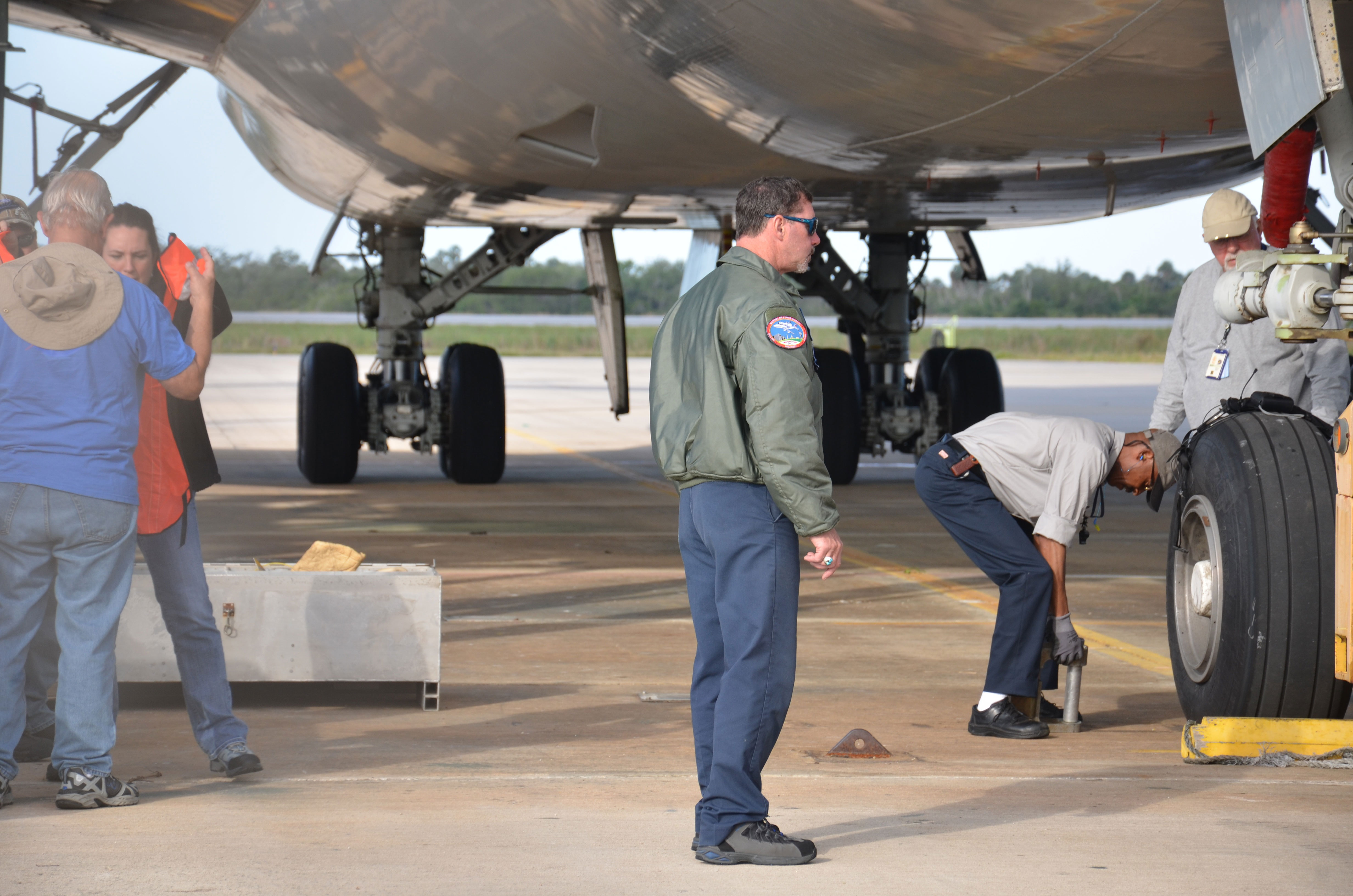 Here's a photo from today showing a shuttle team member wearing the Discovery patch while working under the Shuttle Carrier Aircraft. All three patches were also seen inside the flight ops office at the Shuttle Landing Facility.  |