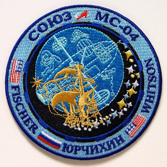 Soyuz MS-04 mission patchRussia's Soyuz MS-04 will launch to the International Space Station in March 2017. Roscosmos cosmonaut Fyodor Yurchikhin and NASA astronaut Jack Fisher will join the Expedition 51/52 crew. The Soyuz MS-04 patch design is inspired on the iconic Apollo 12 patch. The classic sailing ship symbolizes the dream of flying in space. The vessel trails a stream of stars, as used in the patch for Expedition 52, which cosmonaut Yurchikhin will command during the second part of his stay on the International Space Station, symbolized by the single star to the left of the ship. Behind the ship in Earth-like colors is a depiction of Konstantin Tsiolkovski's design for a space station, while the border is similar in design to spaceship commander's Yurchikhin earlier Soyuz patches. His name and that of astronaut Fischer, together with the name of the spaceship incorporating the Roscosmos logo and the space fliers national flags occupy the border of the logo. Designed by Luc van den Abeelen. © Roscosmos/spacepatches.nl.  |