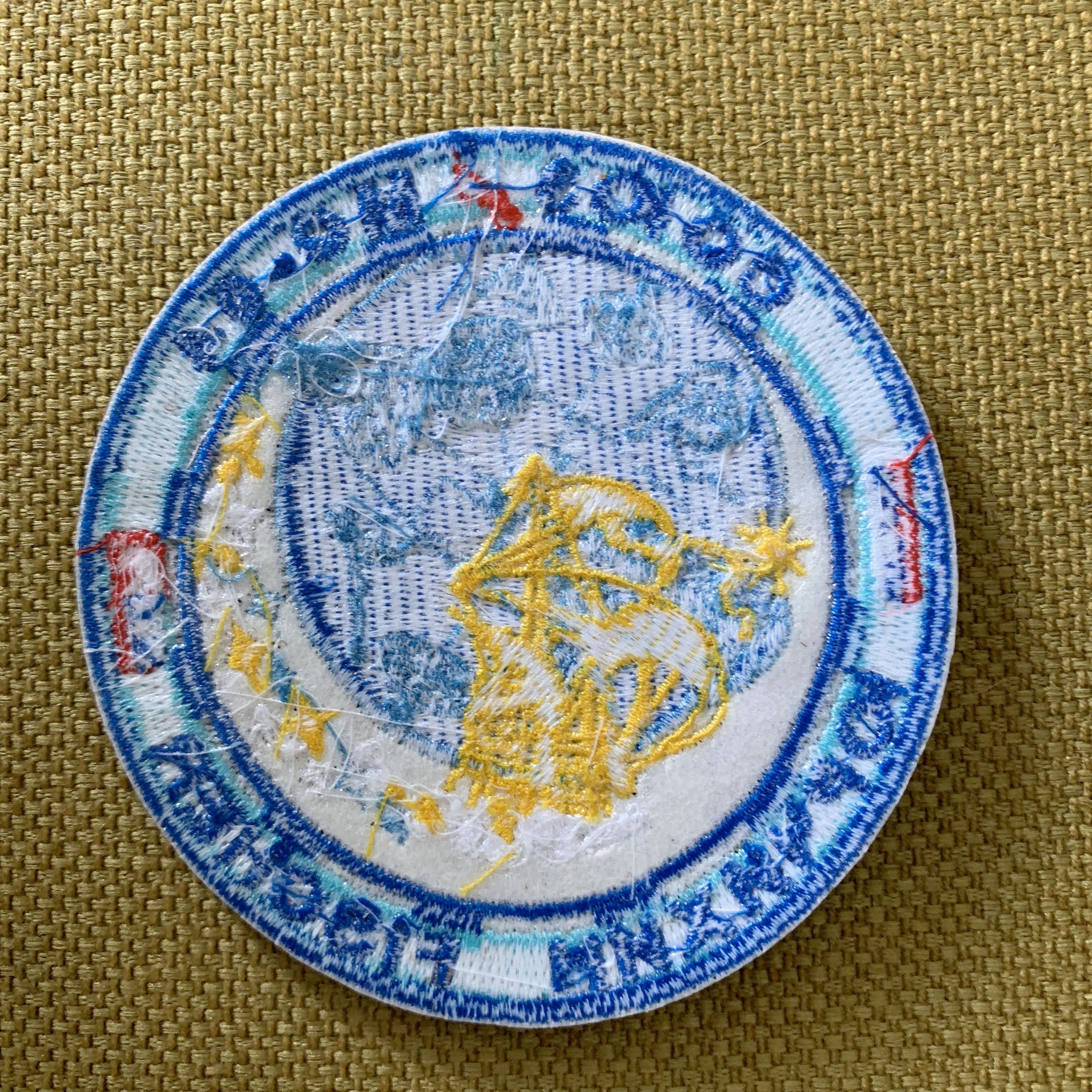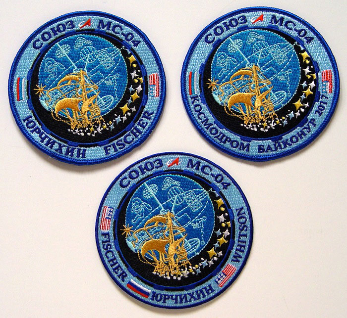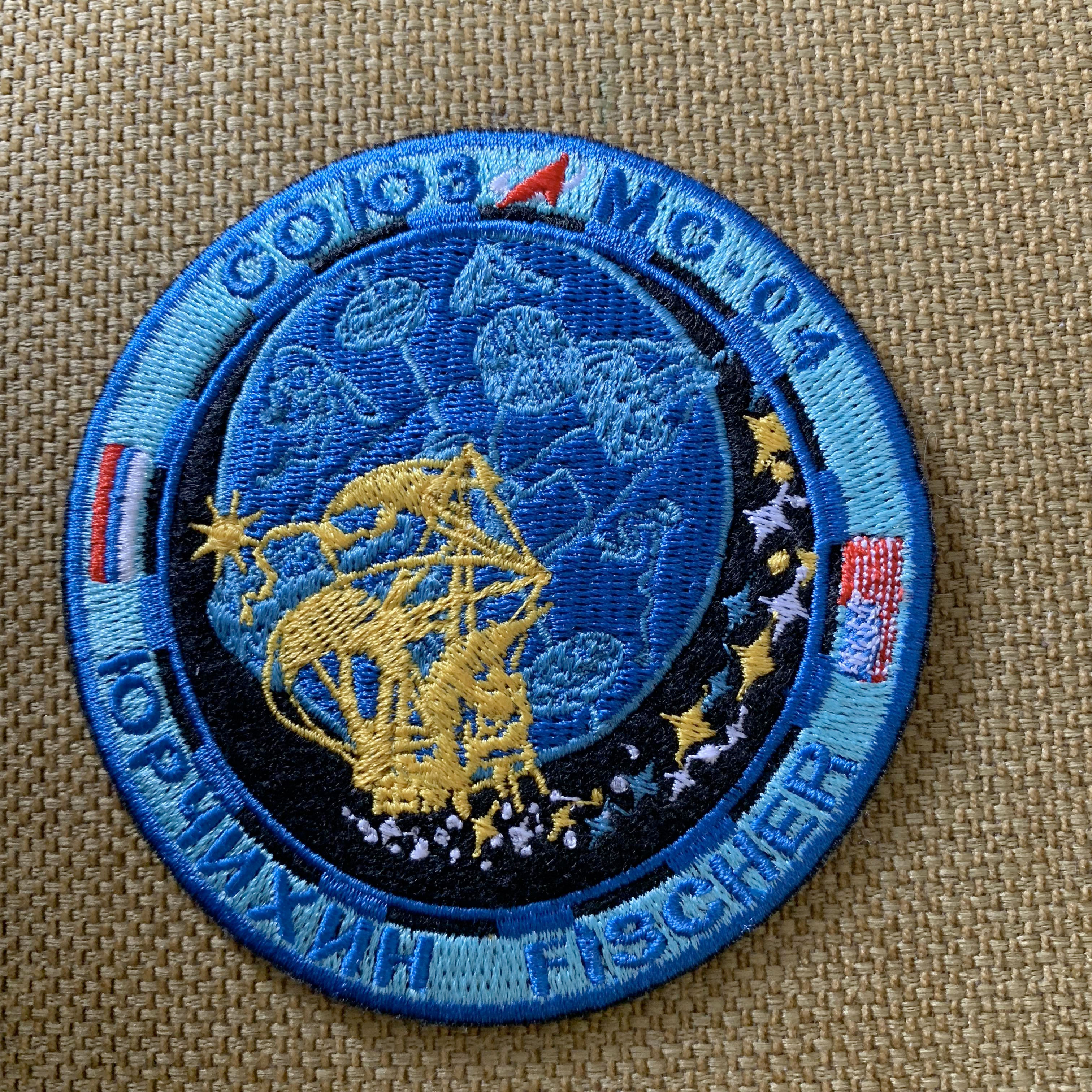 Here’s a shot of the MS-04 landing patch. Somewhat hard to see if you’re not looking for it, the word Argo (the legendary ship of Jason and the Argonauts) is stitched below the ship in ancient Greek: Ἀργώ.  Below is the landing patch compared to the Roscosmos prime crew and backup crew patches. Notably, the landing patch has a cut edge and plastic backing. The crew patches are fully merrowed edges and come with plastic and cloth backs (the latter for sewing onto flight garments).  |