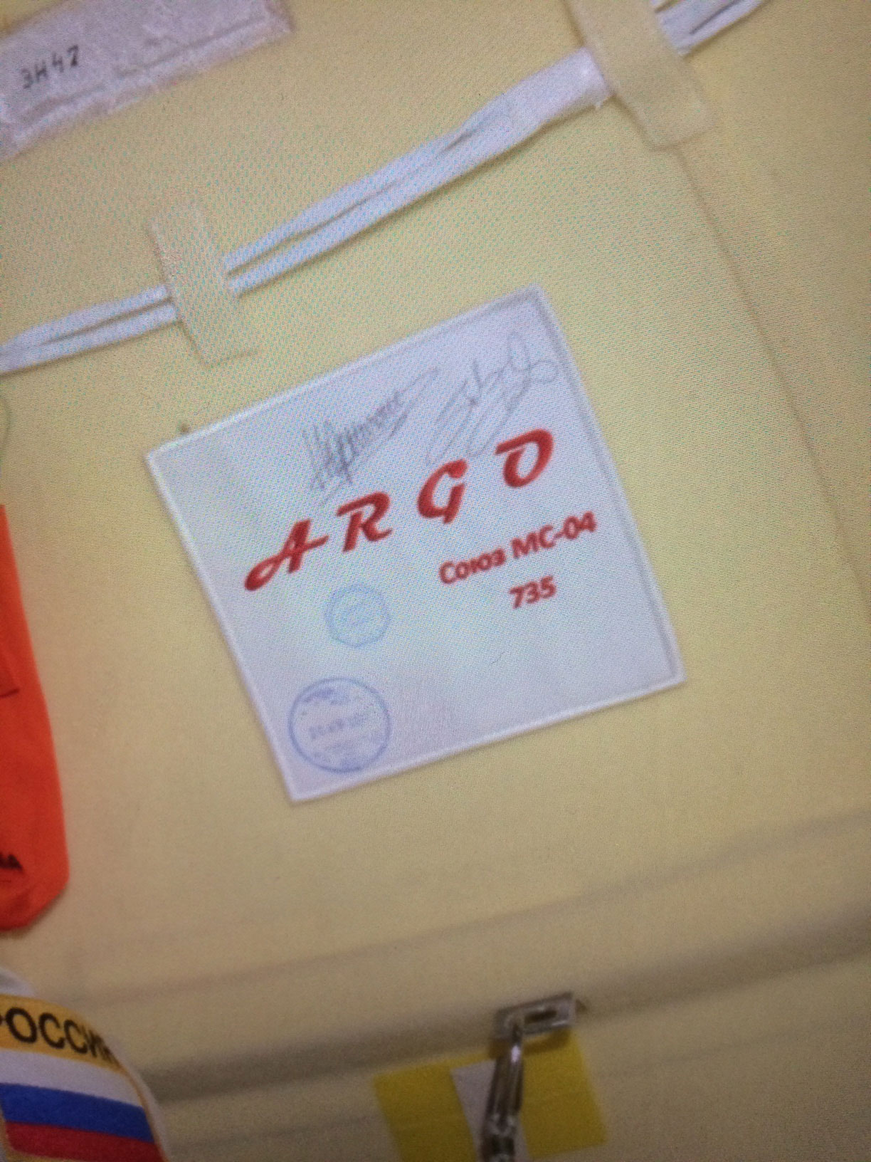 A panel Energia and Fedor Yurchikhin produced because the Soyuz MS-04 was called by the crew "Argo" — legendary ship of argonauts (Greek mythology). Fedor's mother is Greek. Argo in Greek is seen on the landing version of the MS-04 patch. Here the panel is on the wall of the living compartment of the ship docked to the space station.  |