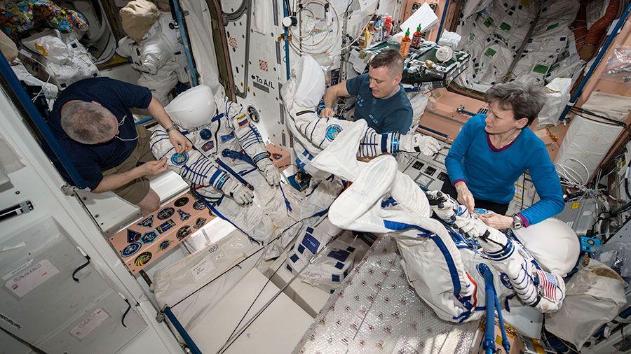 A photo showing the crew affixing the Soyuz MS-04 landing crew patches to their Sokol pressure suits: |