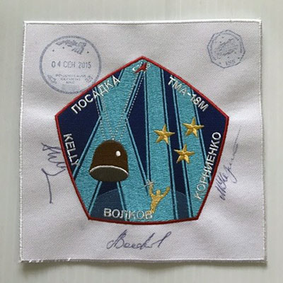 As mentioned in the above description, Scott Kelly can be seen wearing the patch post-flight on his Russian-issued flight suit (on his right shoulder): Here is a scan of the embroidered patch:  And here is a photo of a flown example:  |