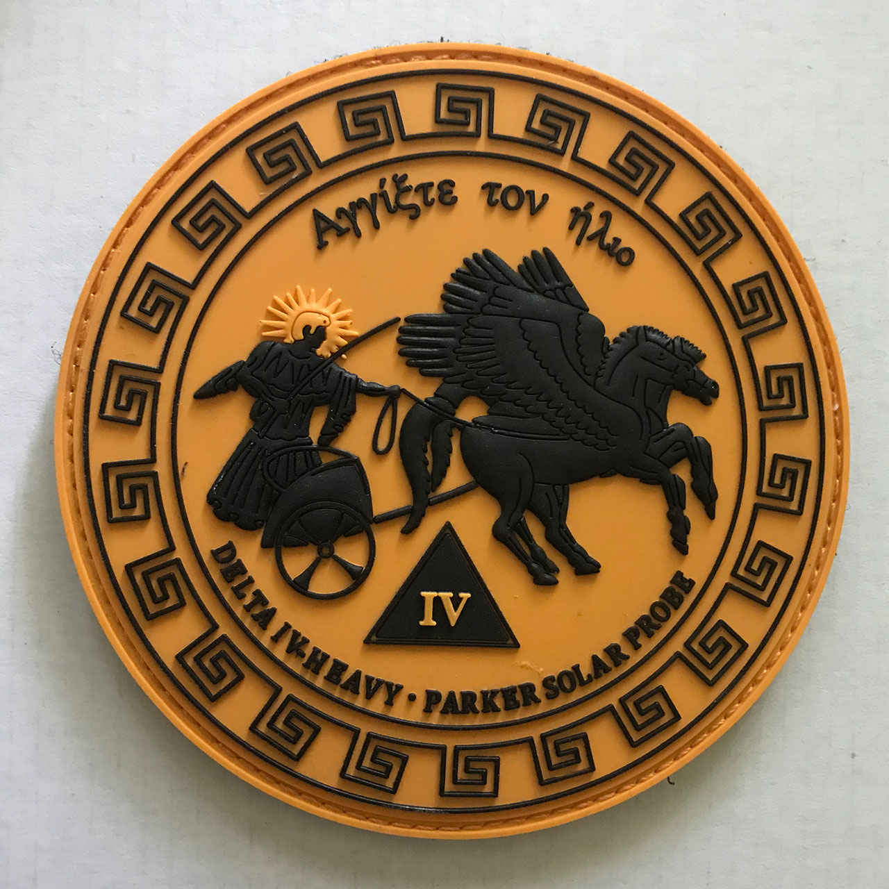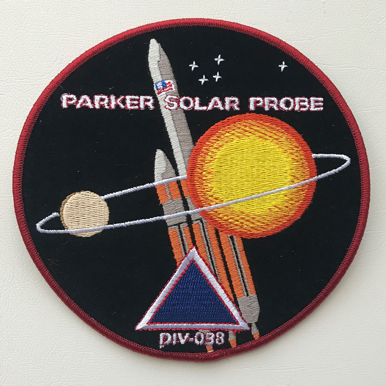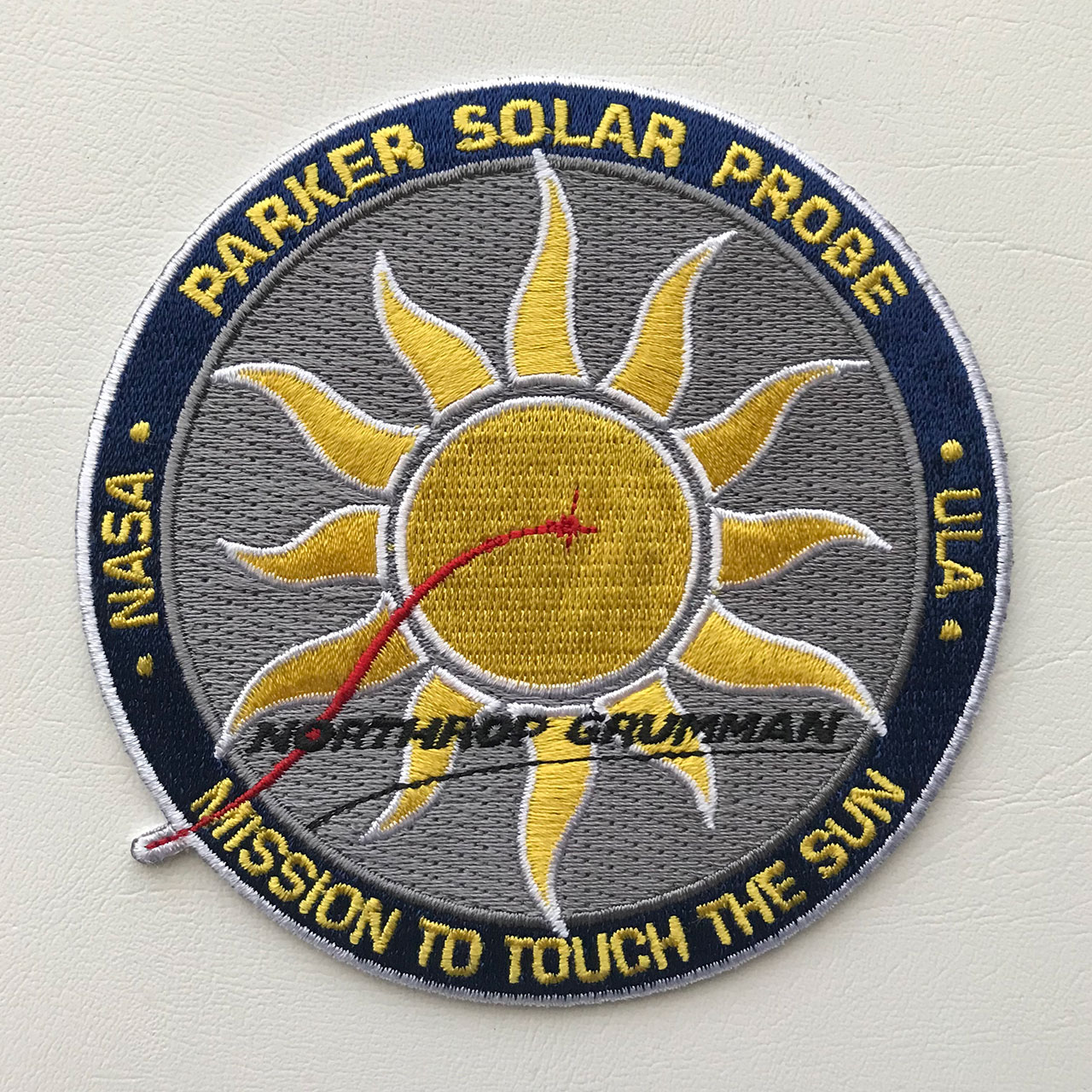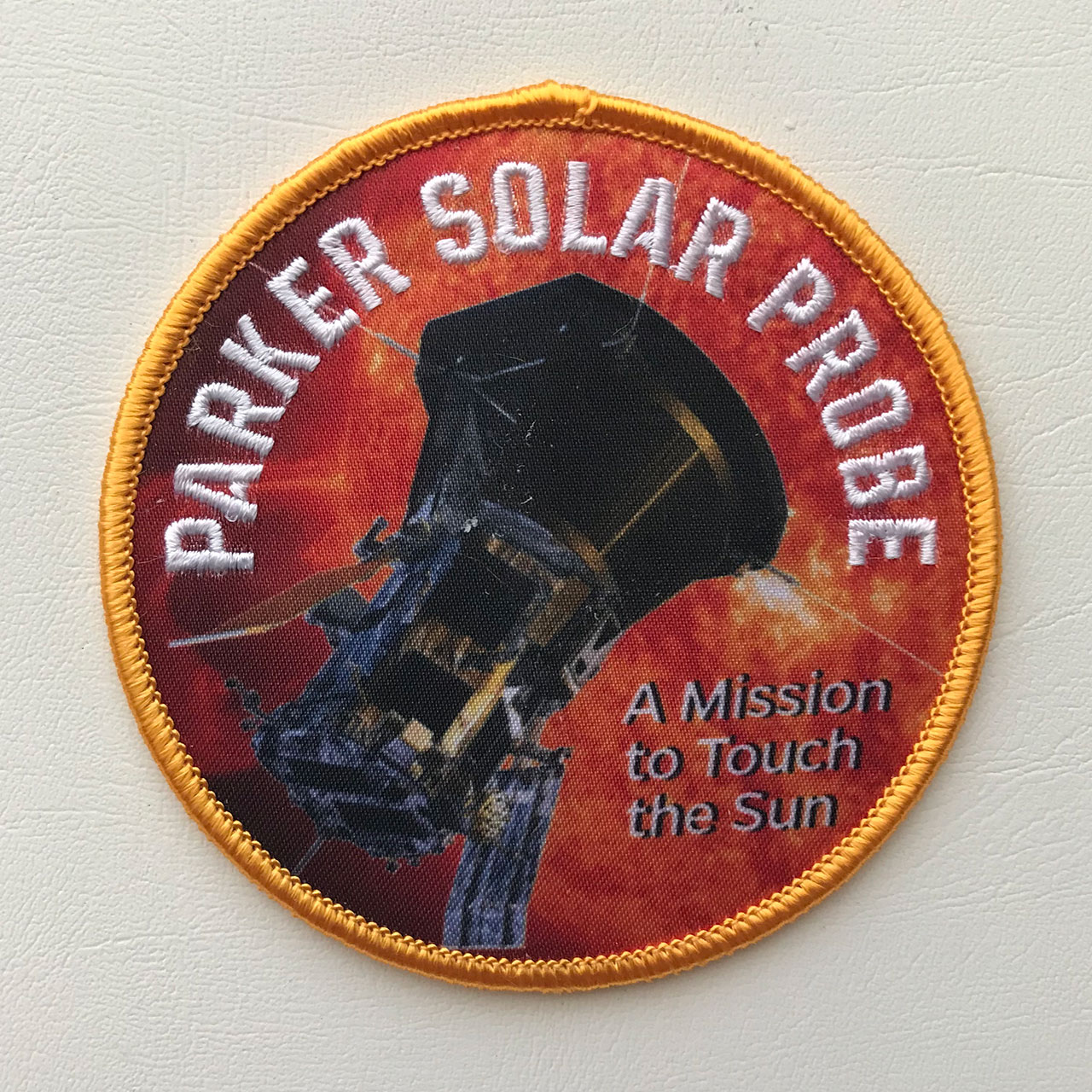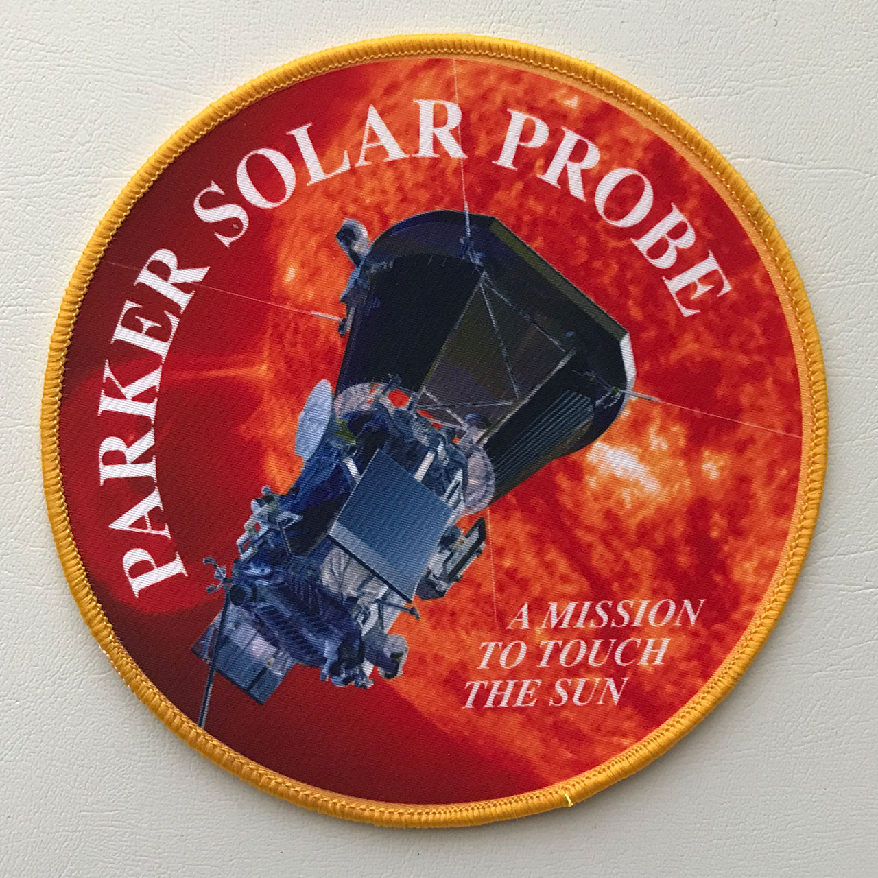 NASA's Parker Solar Probe will "touch the Sun," flying directly through the solar corona, facing brutal heat and radiation conditions to provide close-up observations of our solar system's star.Here is the Parker Solar Probe mission insignia:  Partially embroidered 4" patch via Johns Hopkins Applied Physics Laboratory:  Silkscreened 5" patch via 45th Space Wing:  |