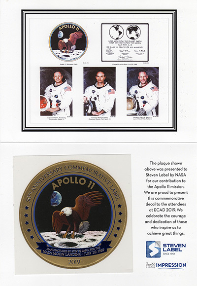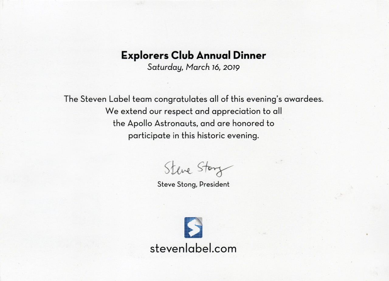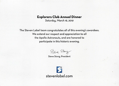 In 1969, Steven Label was commissioned by NASA to produce Apollo 11 mission emblem decals. The company commemorated its contribution and the 50th anniversary of the Apollo 11 mission at the Explorers Club annual dinner in March.